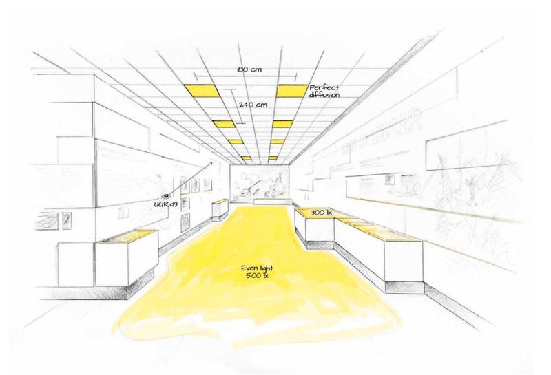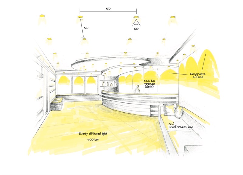 Il progetto viene restituito al cliente attraverso ad elaborati grafici che illustrano lo scenario luminoso che si andrà a realizzare, planimetrie con layout prodotti, “falsi colori” e verifiche illuminotecniche.